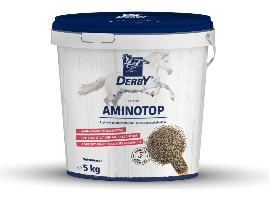 Aminotop od Derby je doplňkové krmivo pro všechny koně, u nichž by měl být dostatek esenciálních aminokyselin. Zejména u sportovních a chovných koní je dodání aminokyselin přínosem. U sportovních koní jsou aminokyseliny vhodné pro zajištění a udržení svalové hmoty. Aminokyseliny jsou dostupné pro metabolismu svalů přímo a zajišťují přísun aminokyselin podle potřeby. Dodávka aminokyselin podle potřeby je zvláště důležitá pro chovné koně, aby mohla březí klisna a ještě nenarozené hříbě využít veškerý růstový a vývojový potenciál. Potřeby koní pokryjí i malé denní dávky Aminotopu.