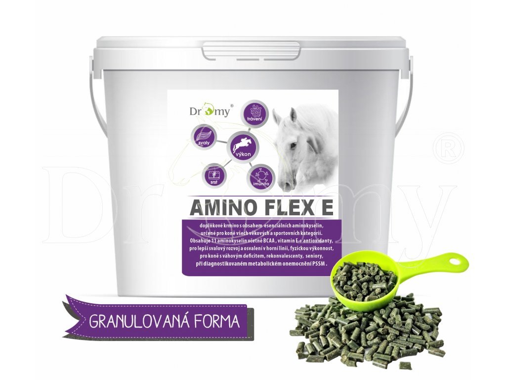 Amino Flex E je granulovaný vysoce kvalitní balancer s obsahem esenciálních aminokyselin v koncentrované formě a obsahem 52% proteinů, určený pro všechny kategorie koní.