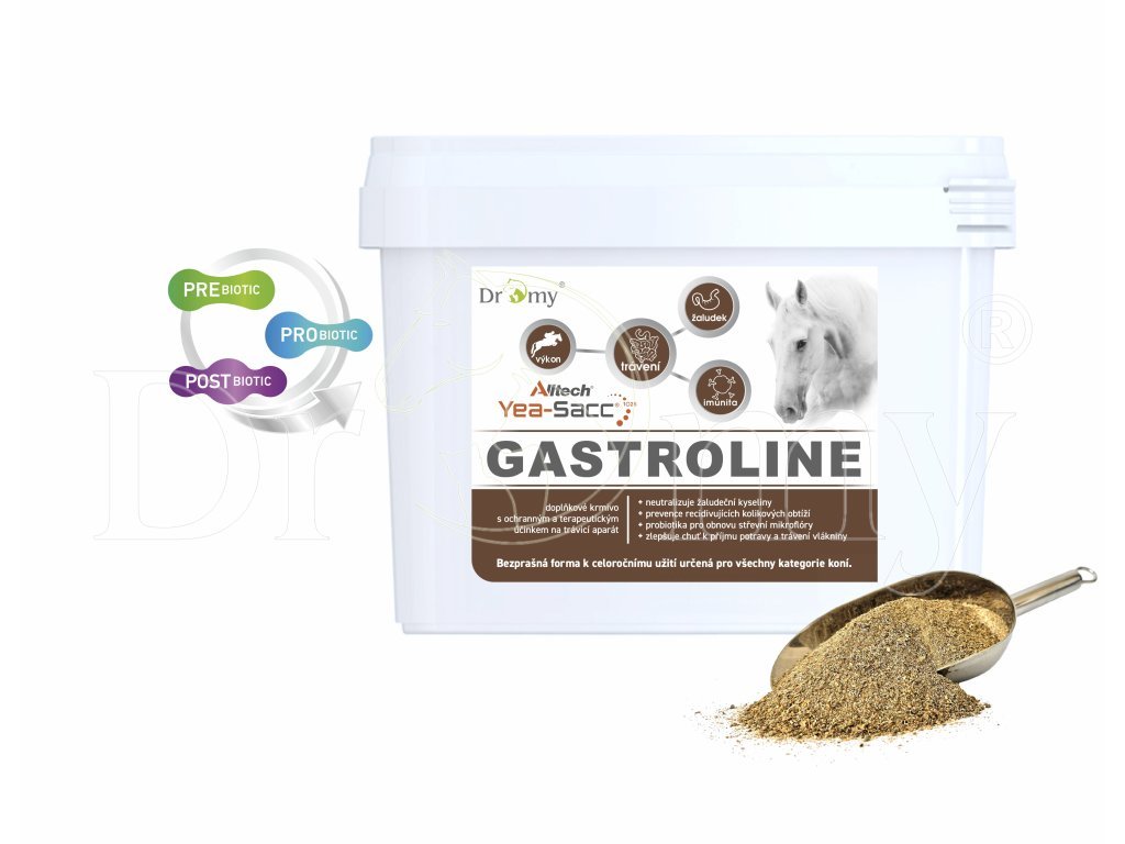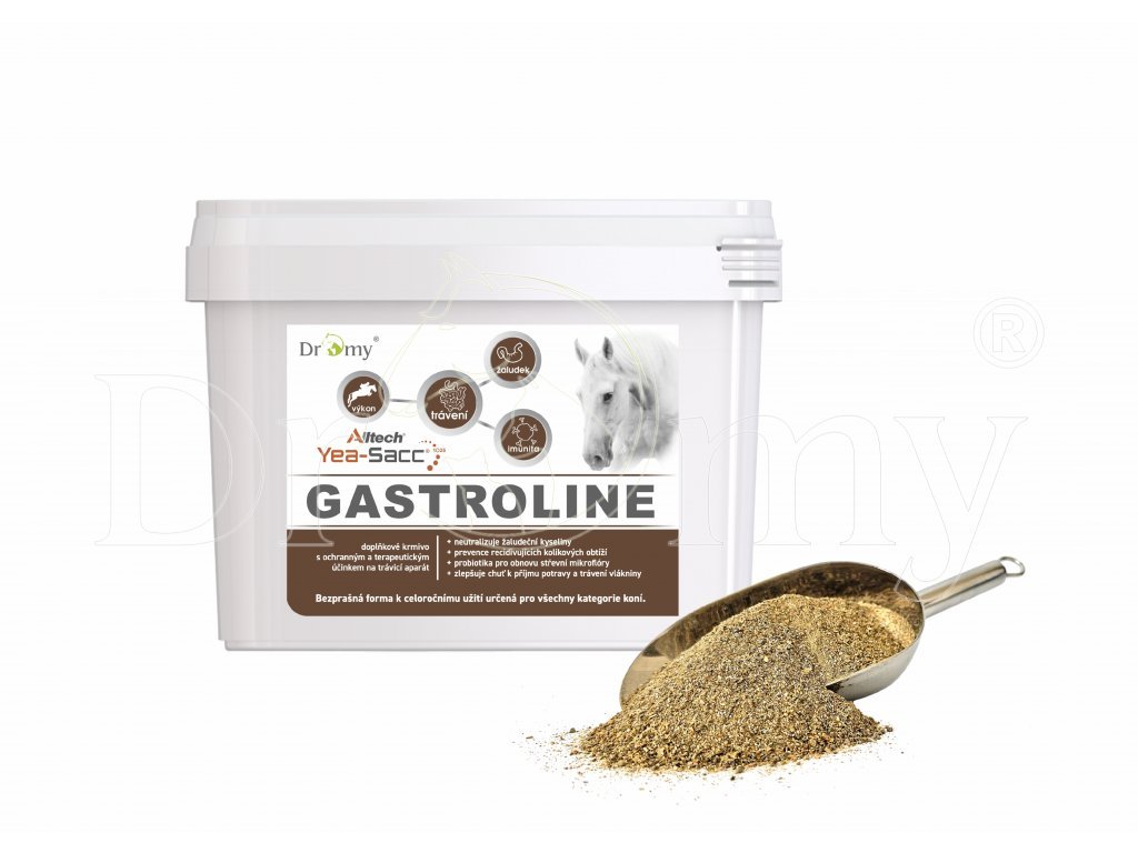 Gastroline přispívá k vybalancování těchto nepoměrů i u sportovních koní a pomáhá minimalizovat negativní vliv na trávicí trakt. Je současně zdrojem vysoce vstřebatelného, biologicky aktivního vápníku a také významným zdrojem důležitých minerálních látek a stopových prvků nezbytných pro celkové zdraví organismu. Doplňkové krmivo je určeno k redukci a prevenci stresových reakcí gastrointestinálního aparátu. Ochrana povrchu žaludeční sliznice a neutralizace žaludečních kyselin s pomalým nástupem účinku a s prodlouženým působením, pomáhá eliminovat problémy žaludečních vředů. Zvápenatělé mořské řasy rodu Lithothamnium mají zvláštní porézní voštinovou strukturu podobnou včelím plástům s velkou plochu povrchu (>10 m2) na 1g, díky které mají řasy výbornou schopnost dlouhodobě regulovat hladinu žaludeční kyselin až po dobu 4-6 hodin.