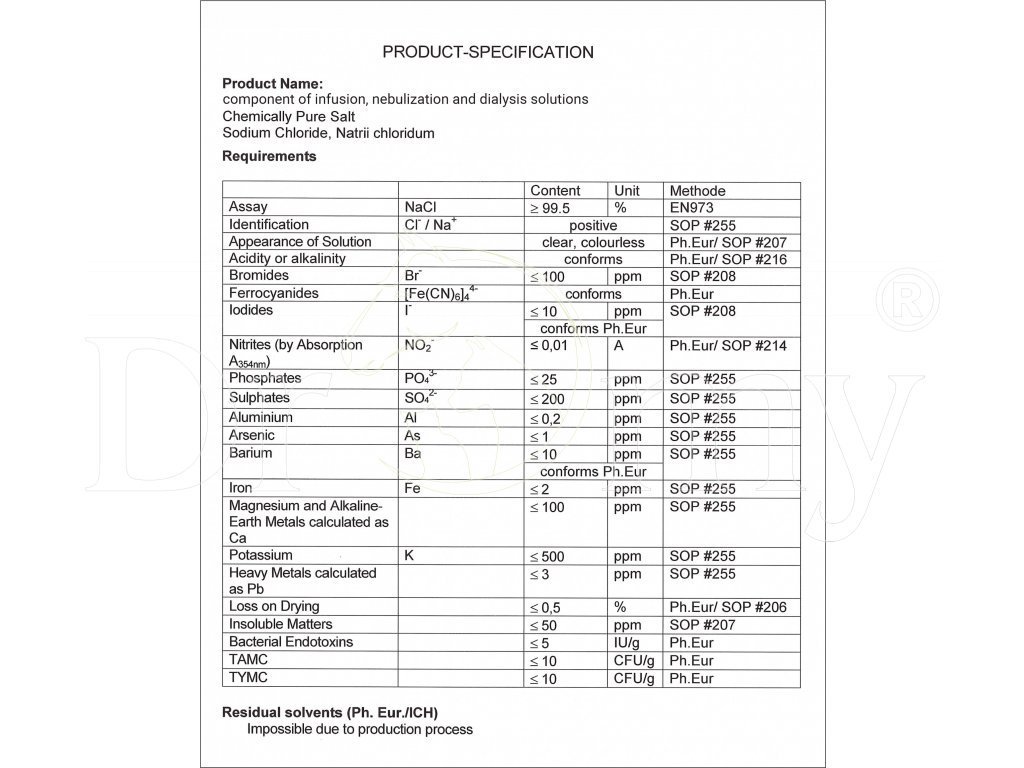 Čistá farmaceutická sůl pro lékařské a farmaceutické účely, bez přísad a pomocných látek, splňující nejvyšší standardy Evropského lékopisu Ph.Eur.9, BP, USP, JP.