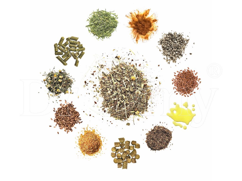 Doplňkové krmivo pro koně - složení: travní směs timotejka, kostřava, lipnice, dactylis, sušená vojtěška, cukrovarské řízky nemelasované, jablečná dužina, lněné semeno, Alltech - NuPro®, mrkvová dužnina, bylinný premix - kopřiva, máta, fenykl, tymián, šípek, aronie, heřmánek, pískavice, pampeliška list, echinacea, tráva z mladého zeleného ječmene, ostropestřec semeno, hrachová vláknina, pivovarské mláto, řepkový olej.